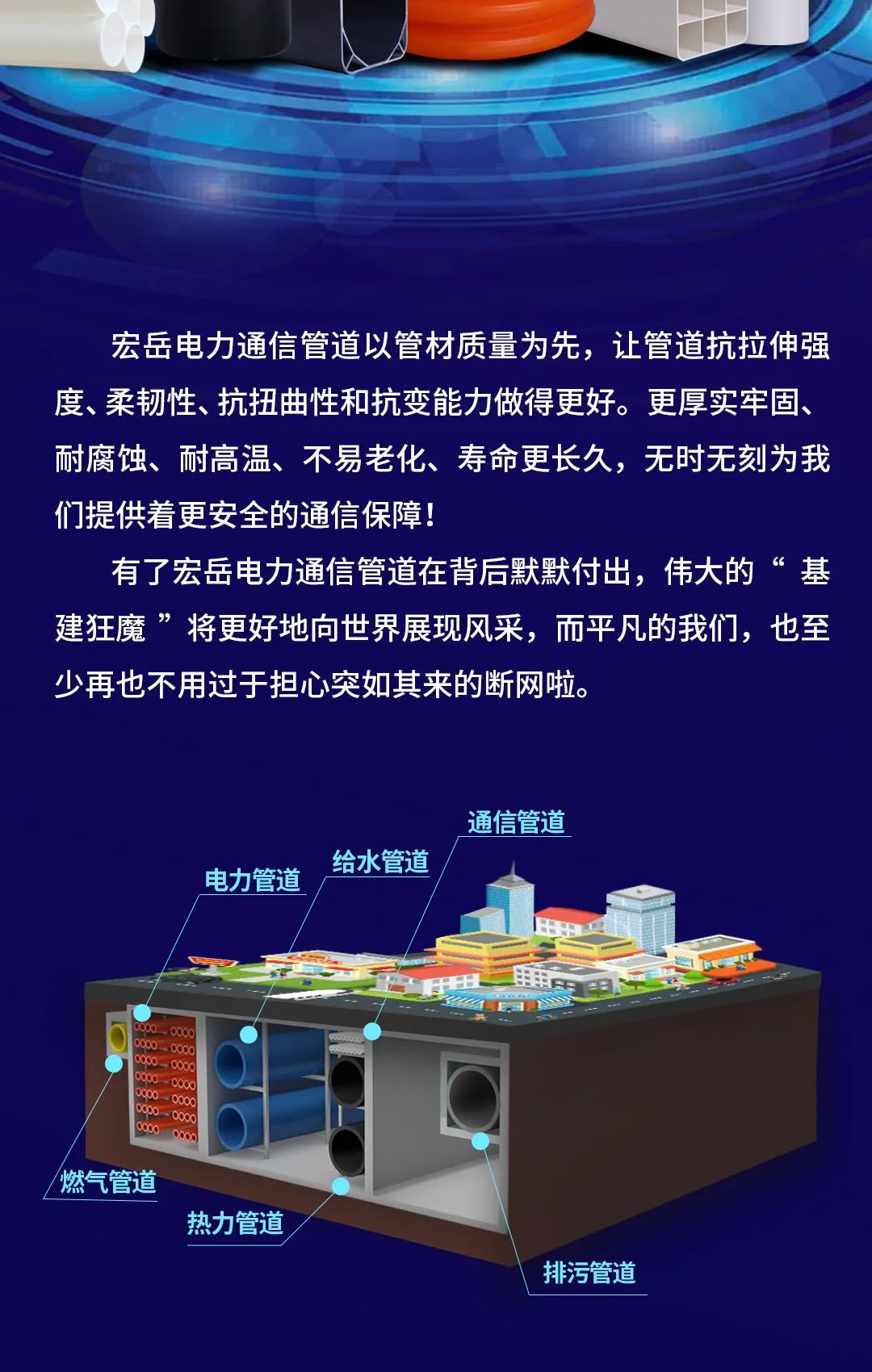 电力通信管道以管材质量为先,让管道抗拉伸强度、柔韧性、抗扭曲性和抗变能力做的更好。更厚实牢固、耐腐蚀、耐高温、不易老化、寿命更长久,无时无刻为我们提供着更安全的通信保障!