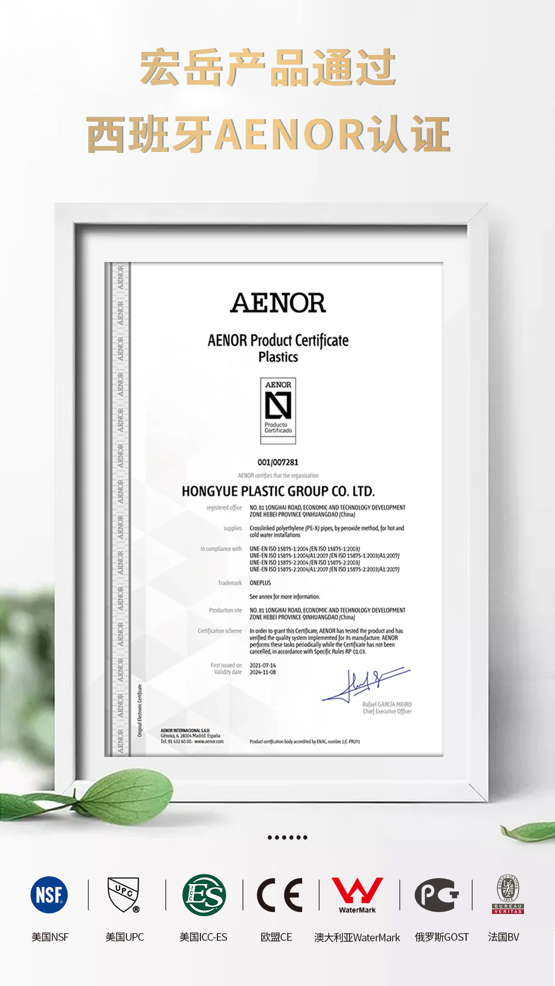 继通过美国NSF、ICC-ES、UPC,欧盟CE,澳大利亚WaterMark,俄罗斯GOST,法国BV等国际认证后,产品又通过西班牙AENOR认证。
